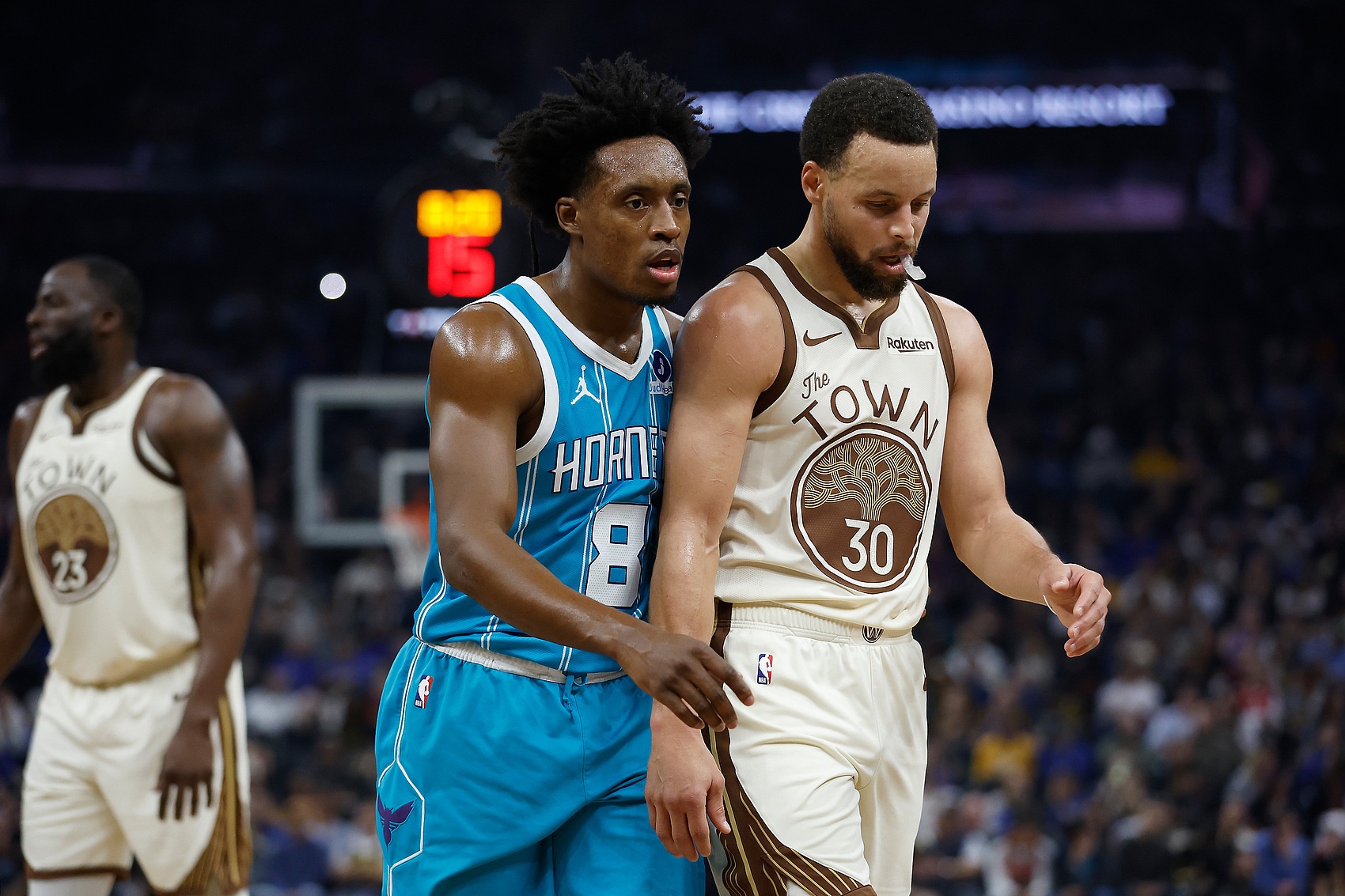这太过分了!塞克斯顿紧随库里身后,一路不肯让步。